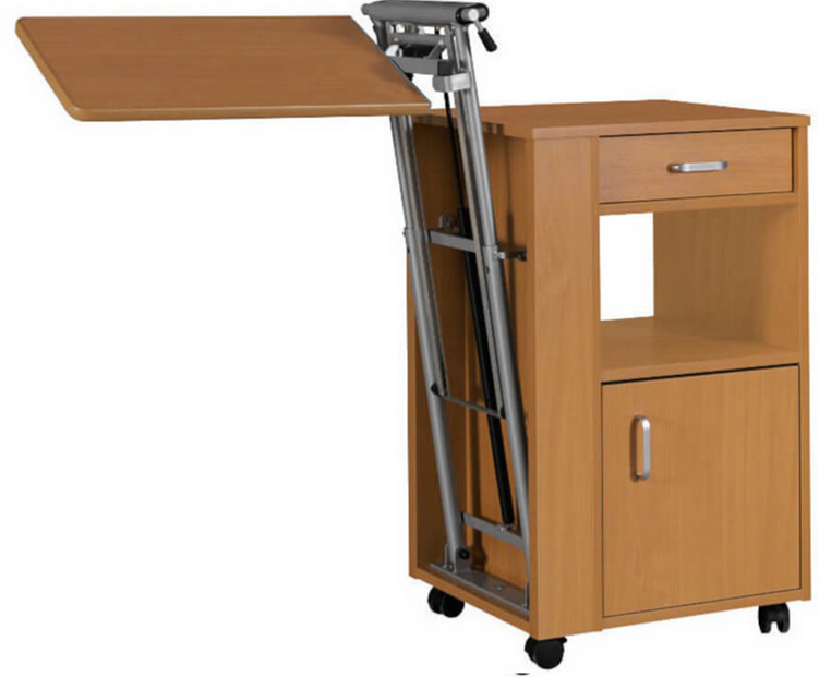 Der Nachttisch Rubens 2 wird serienmäßig in Buchedekor ausgeliefert und fügt sich so harmonisch in die Pflegebettenserie ein. Neben einer Schublade die auf beiden Seiten ausziehbar ist und einem Ablagefach, verfügt der Nachttisch auch über ein durch eine Tür zu verschließendes Abteil welches durch eine Regalplatte nochmals unterteilt ist. Rubens 2 besitzt eine variable Höhenverstellung der Arbeits- oder Abstellplatte wobei diese auch die Möglichkeit bietet diese zu schwenken. Die variable Höheneinstellung wird durch eine Gasdruckfeder unterstützt, so dass dieses auch noch ohne größeren Kraftaufwand zu bewerkstelligen ist. Wird die Arbeits- oder Abstellplatte einmal nicht gebraucht, kann diese an der Seite des Nachttisches eingeklappt werden und ist so bei einem Transport in keinster Weise mehr im Weg.