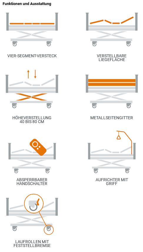Die Liegefläche ist 4-geteilt, mit 2 Einzelmotoren individuell einstellbar und die Einstellung des Fußteils wird durch 2 Rastomaten unterstützt. Die Liegefläche mit Holzfederleisten und Härteverstellern hat in der Standardausführung ein Liegeflächenmaß von 90 cm x 200 cm, sie ist elektrisch verstellbar zwischen 40 cm und 80 cm (Oberkante Liegefläche).