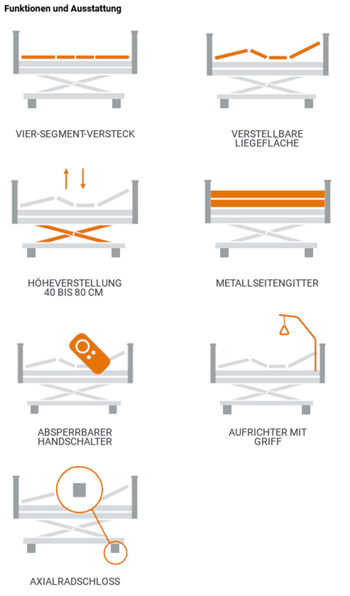 Komfortabel lässt sich jede Verstellmöglichkeit des Bettes über den Spritzwasser geschützten Handschalter steuern, aber auch einzeln absperren. Der Aufrichter ist zur Verstärkung mit einem zusätzlichen Innenrohr ausgestattet und bis 80 kg belastbar.